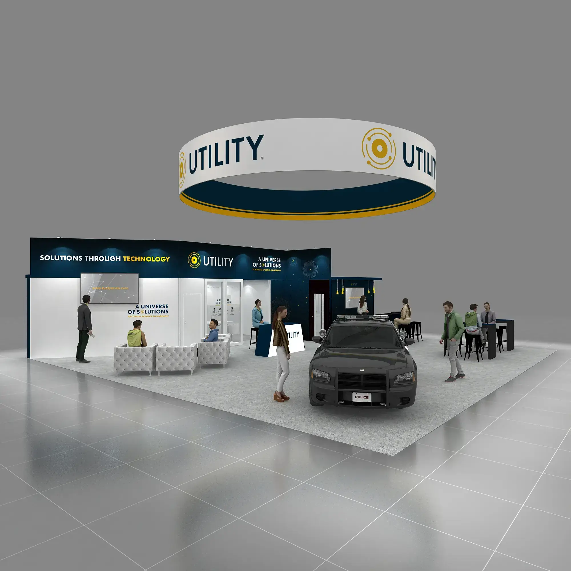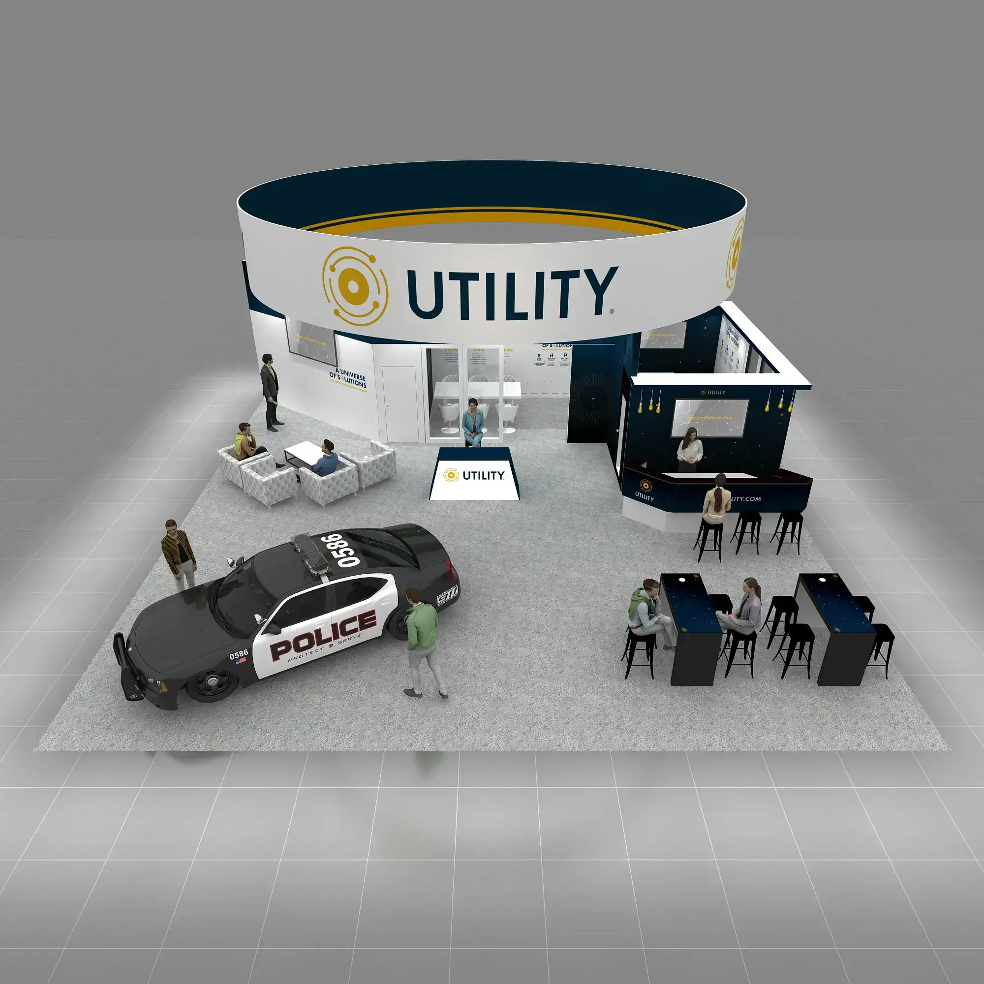• Custom-designed 40×40 island booth architecture with multiple visitor engagement zones.