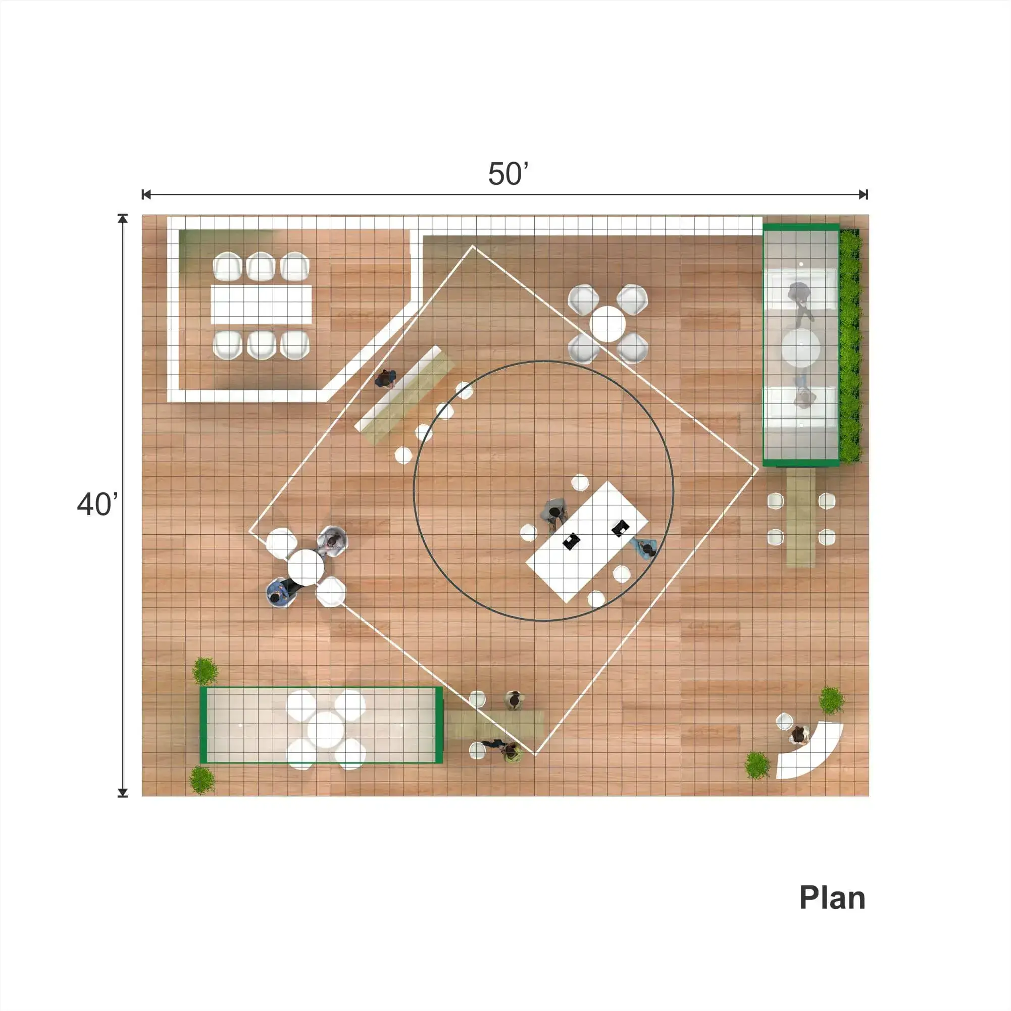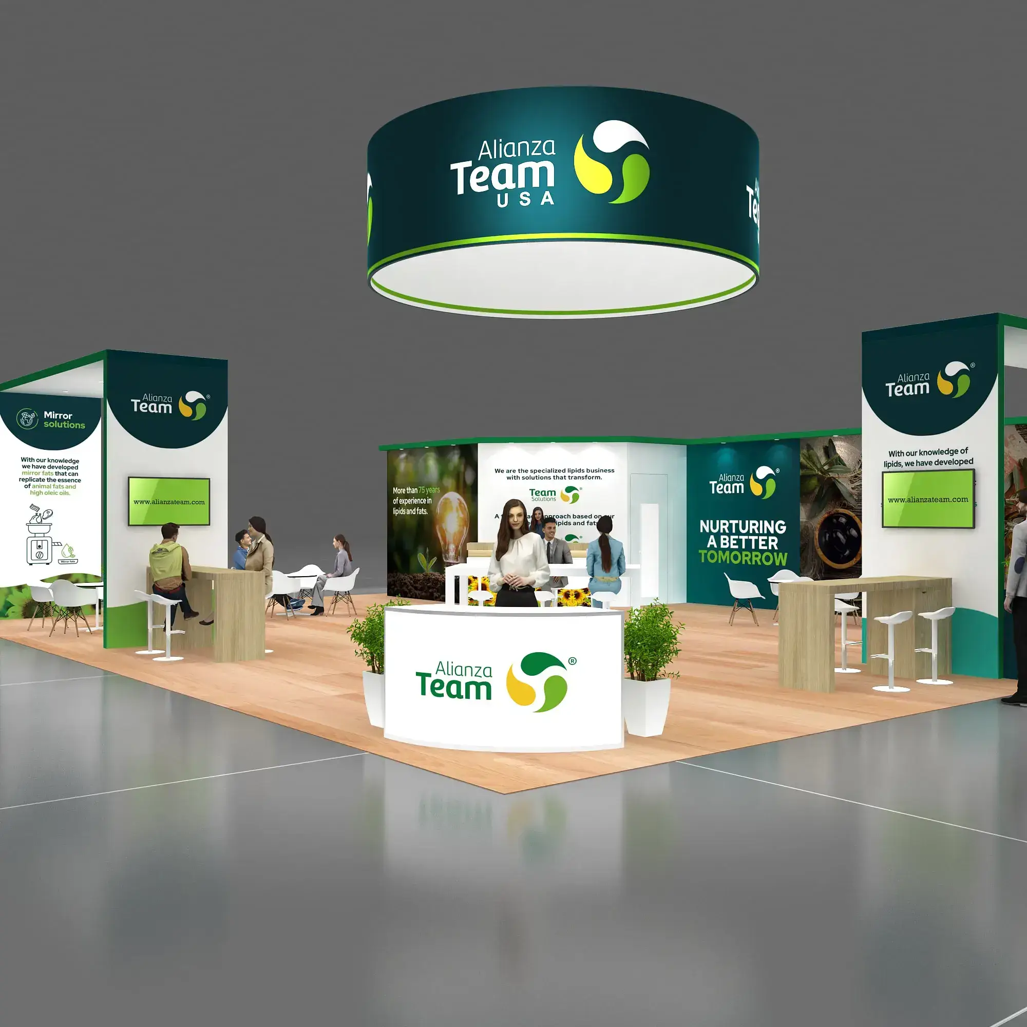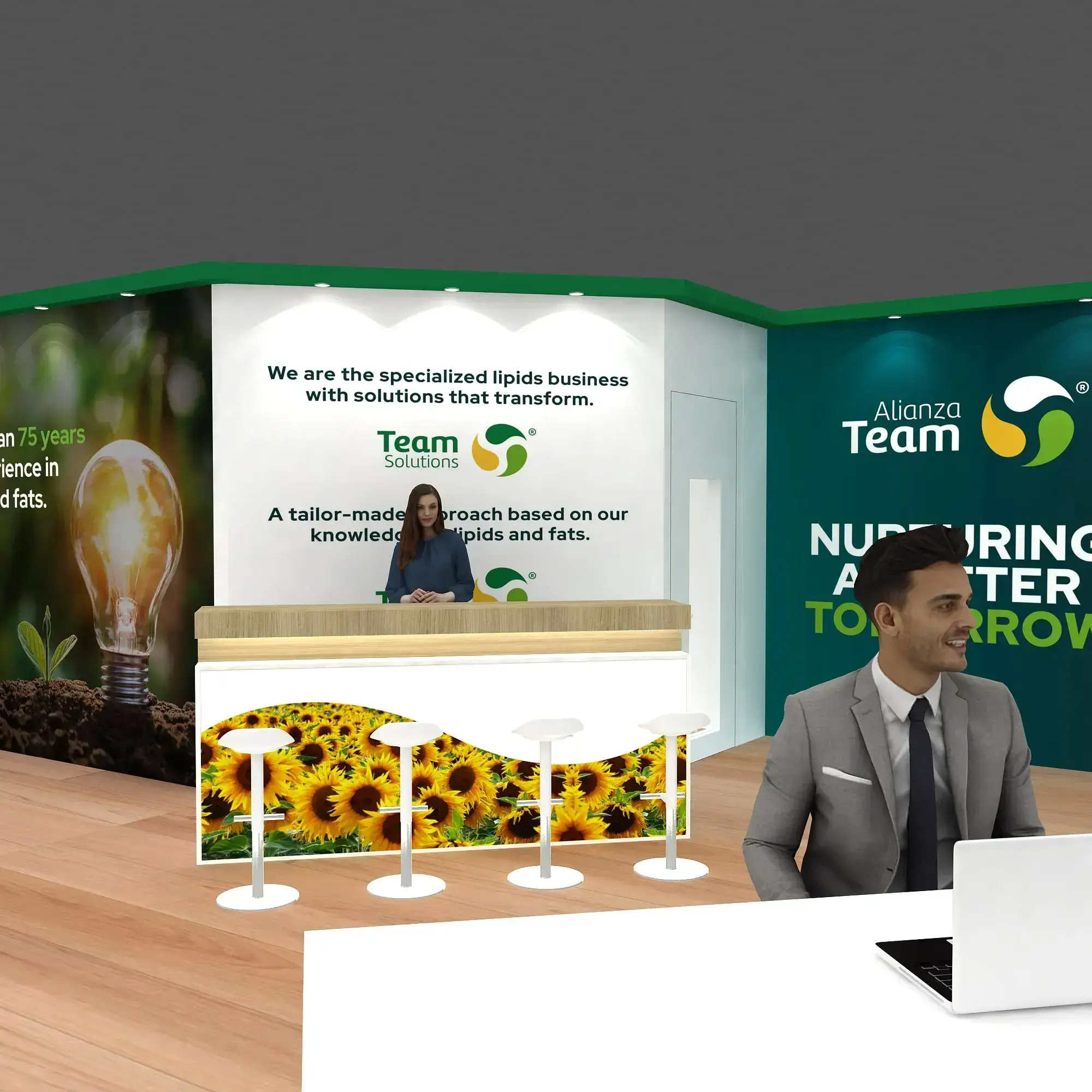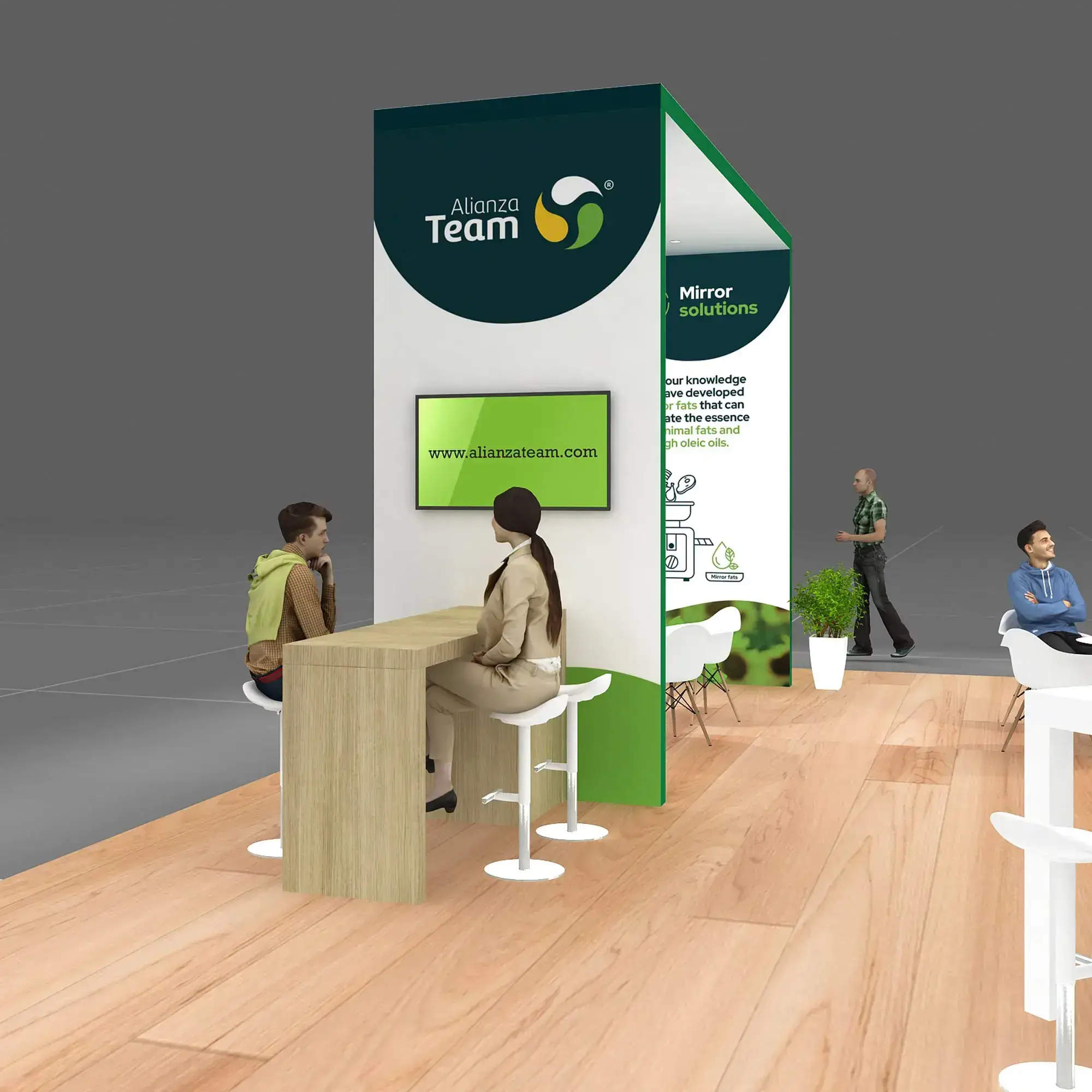 • Branded reception counters, product demo stations, and functional meeting furniture.
