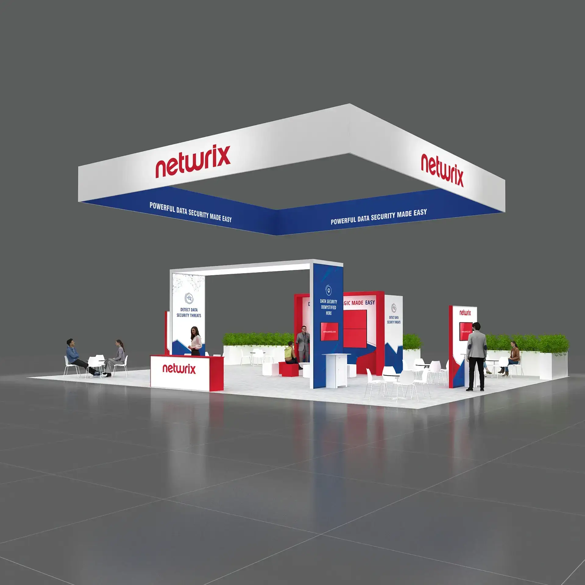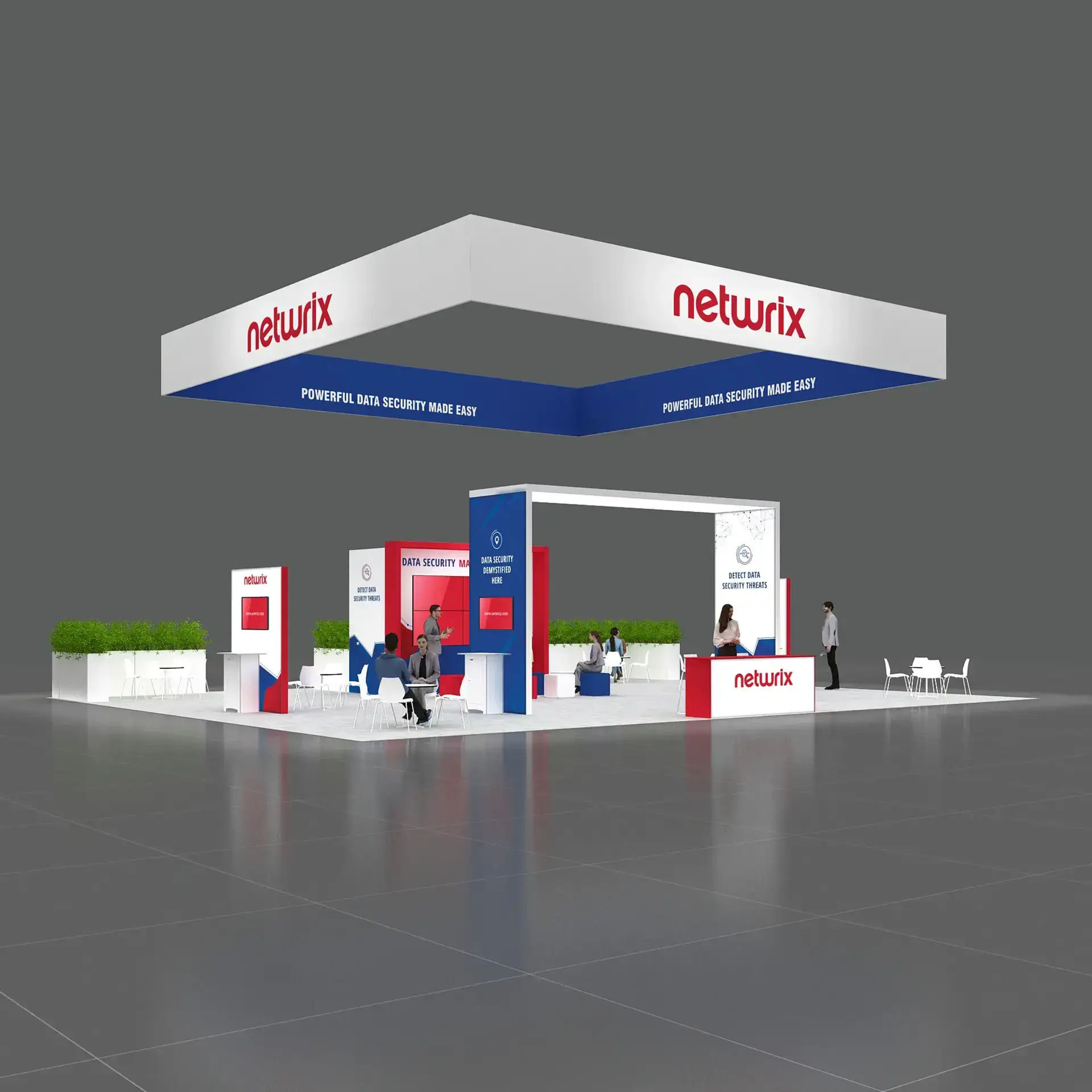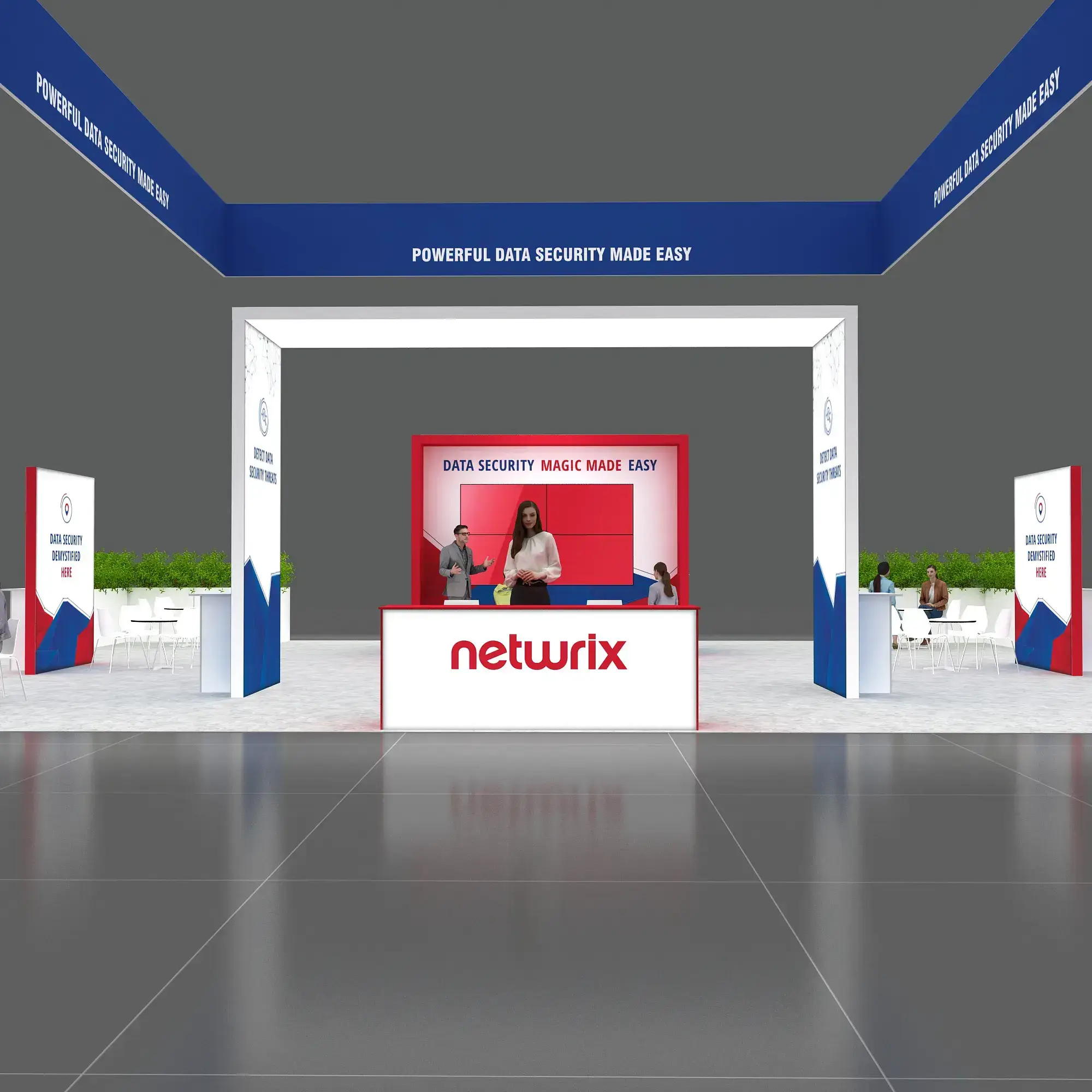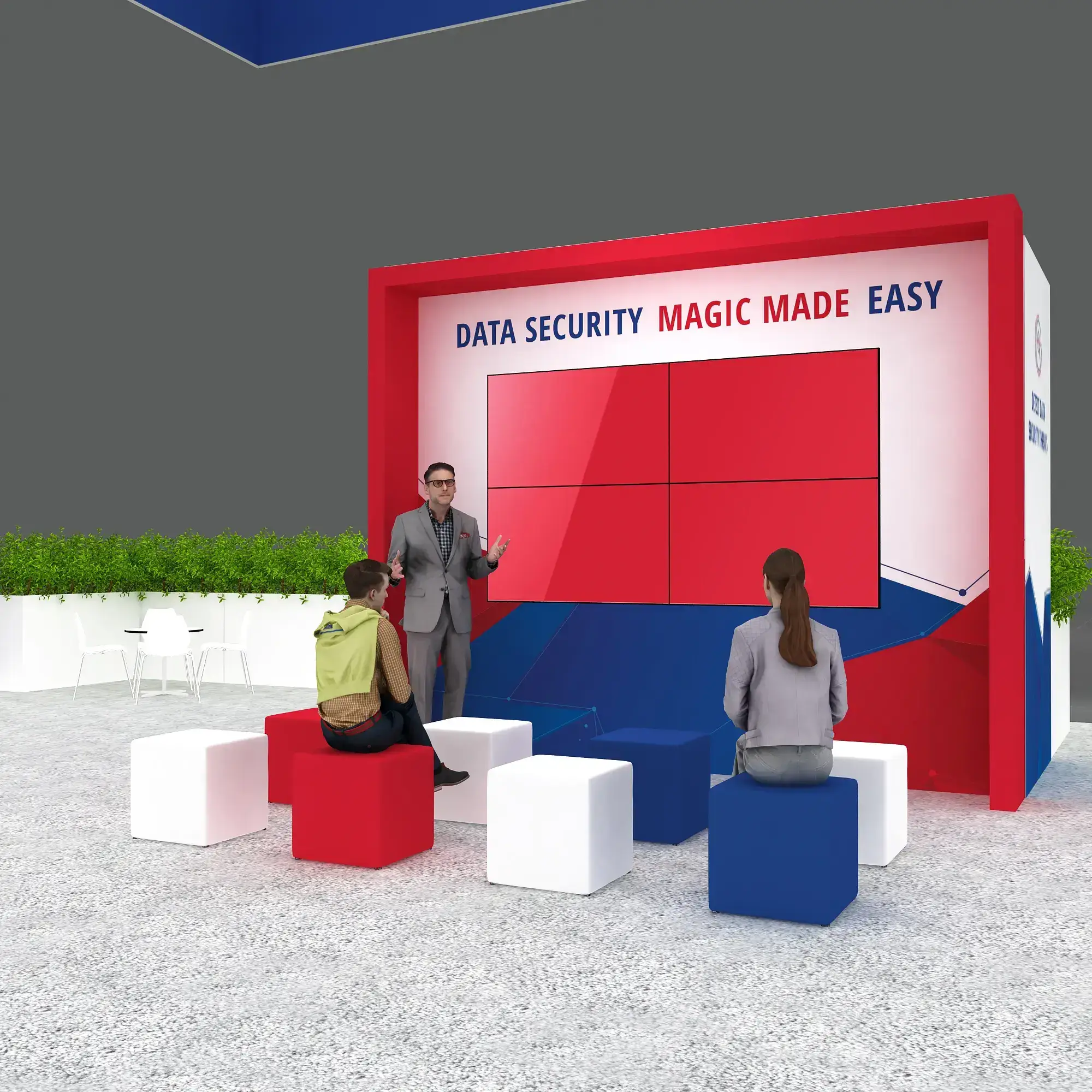 • Large TV displays and digital engagement screens for demos, videos, and lead capture.
