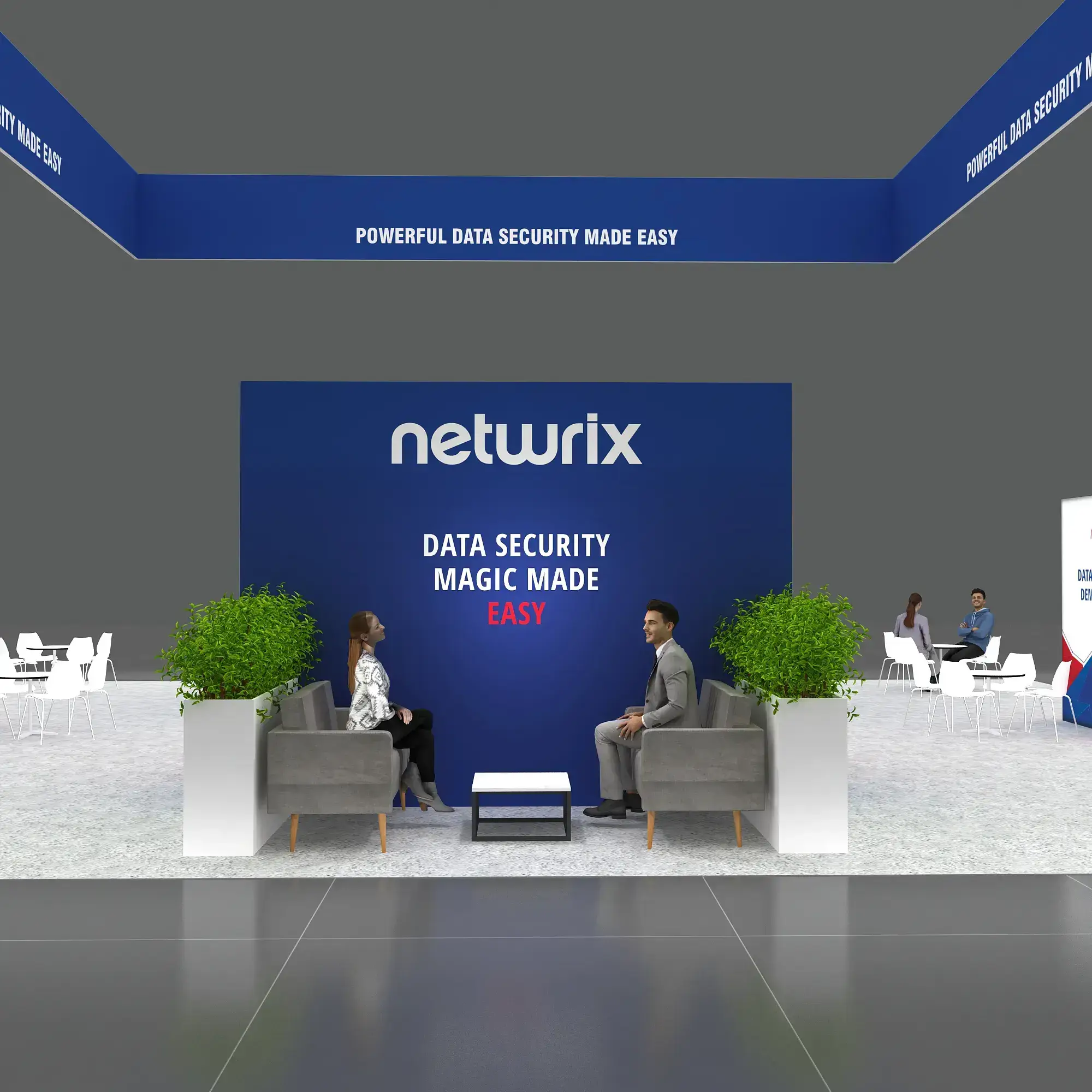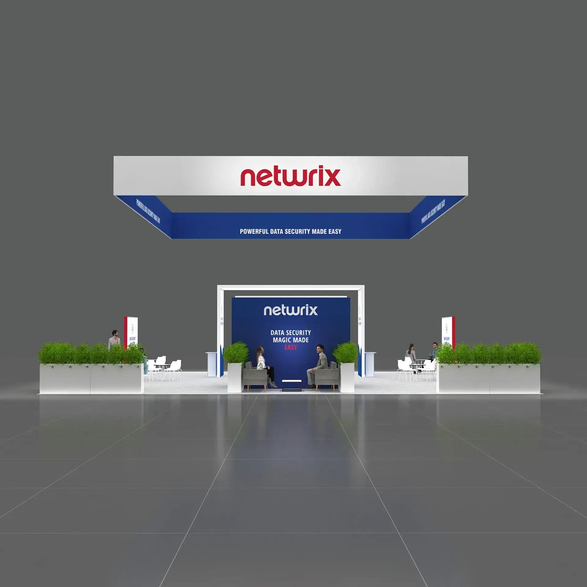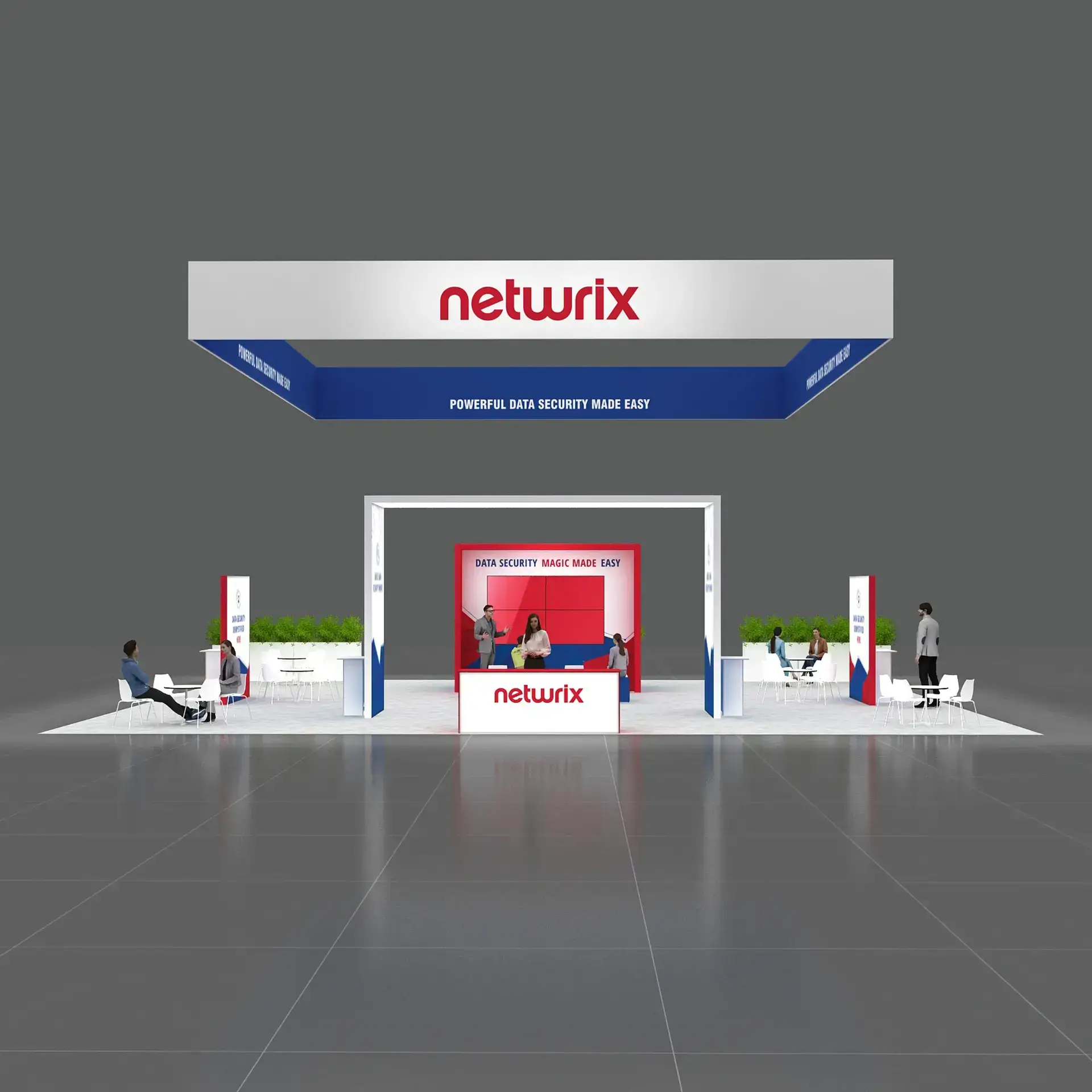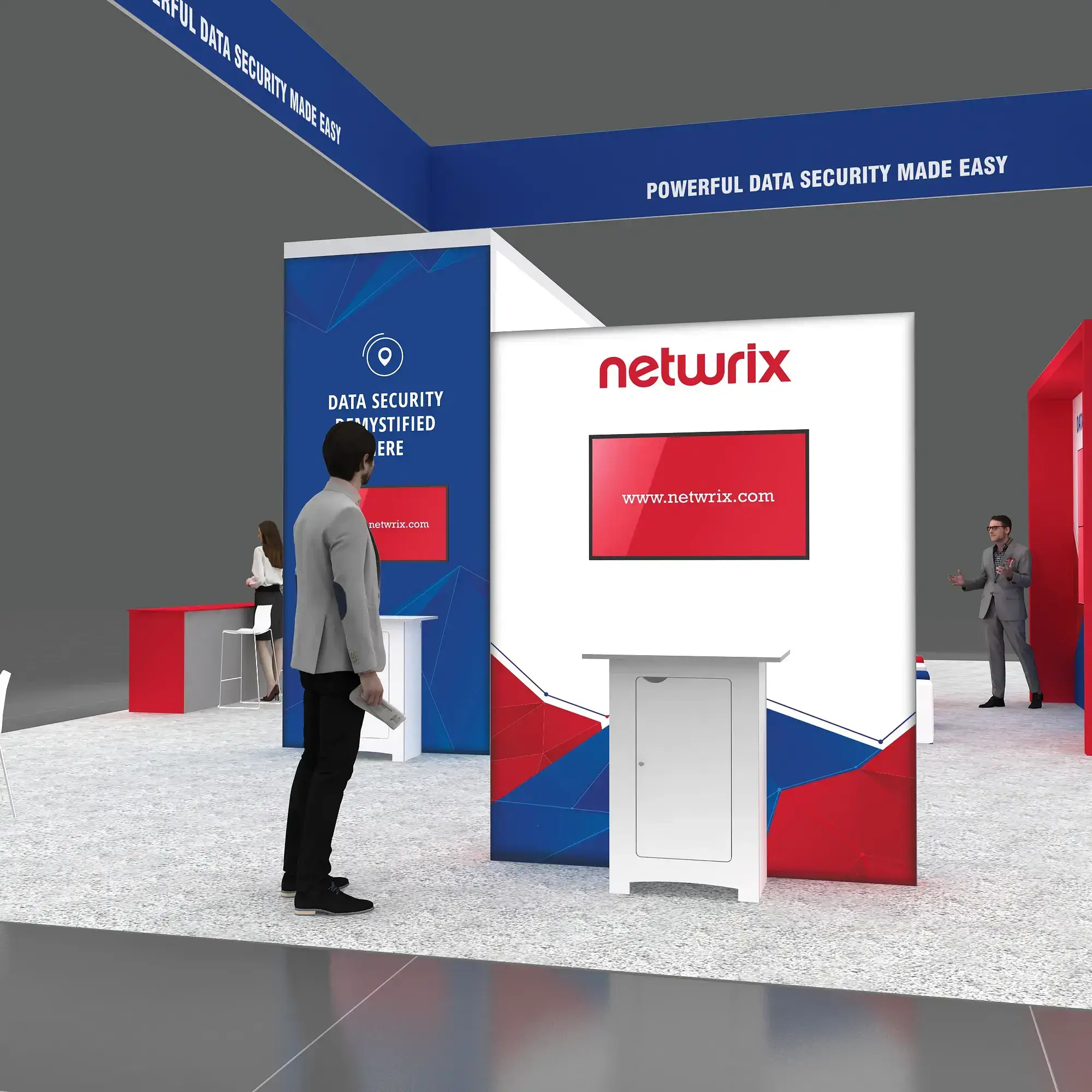 • Large TV displays and digital engagement screens for demos, videos, and lead capture.