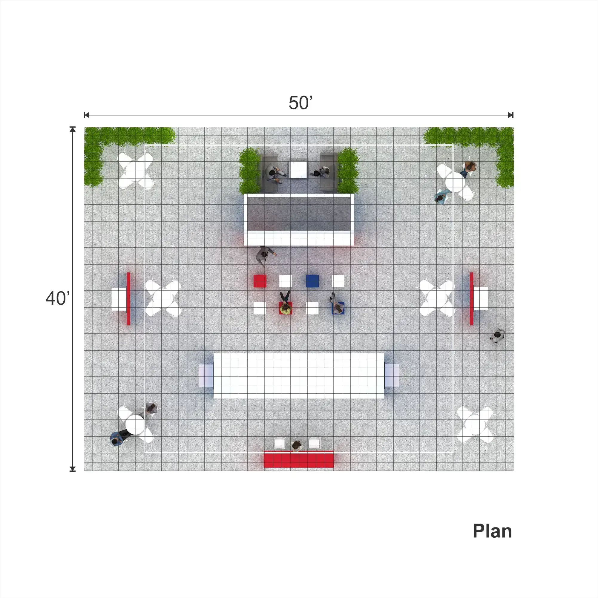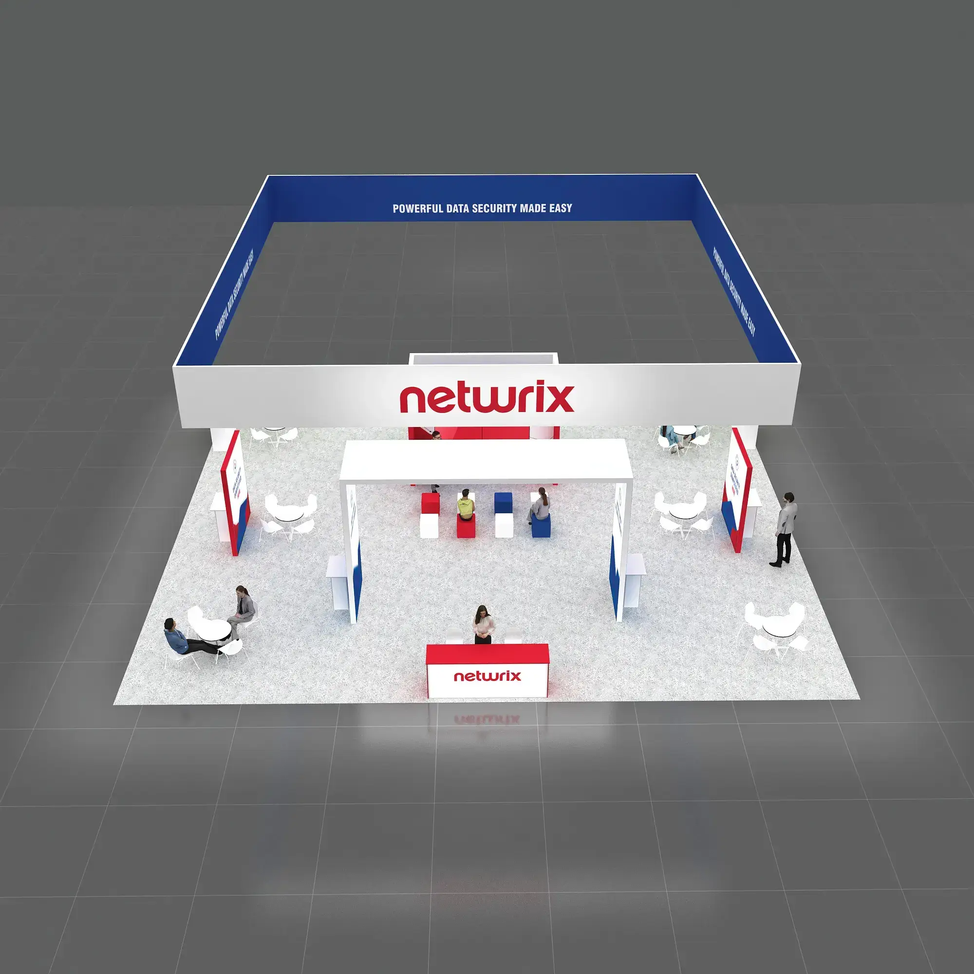 • Custom 40×50 island exhibit design with open sightlines and multiple attendee entry points.